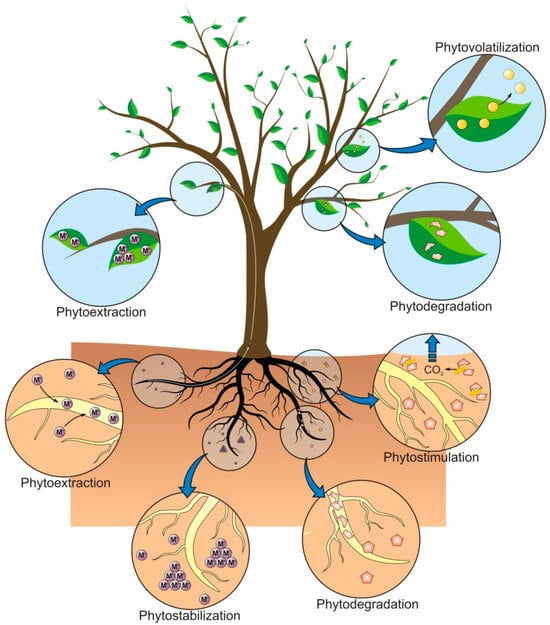 In order to diminish the negative impact of soil-originating impurities, the phytoremediation process is one of the actions undertaken, which consists of taking advantage of plants’ accumulation properties to remediate the polluted soil. Phytoremediation is a process in which living plants are used to reduce the mobility, toxicity, or volume of the pollution in the soil, groundwater, or other contaminated media, so that plants may clean up many kinds of pollution such as heavy metals, pesticides, or oil. While the phytoremediation strategy depends on the types of impurities present and on the soil properties, phytoremediation is a generic term for plant-mediated cleaning processes independent of their action mechanisms, namely phytoextraction, rhizofiltration, phytovolatilization, phytostabilization, phytodegradation, hydraulic control, or rhizodegradation (Figure 5).