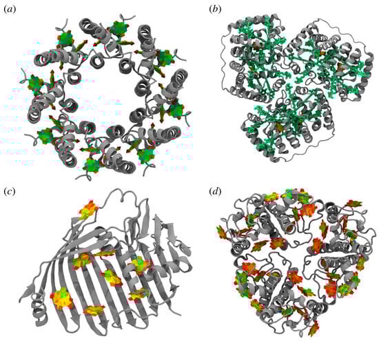 Crystal structures of four representative PPCs found in green plants: (a) Rhodospirilum molischanum (PDB: 1LGH), (b) Amphidinium carterae (PDB: 1PPR), (c) Fenna–Matthews–Olson (FMO) complex (PDB: 3EOJ), and (d) Spinacia oleracea (PDB: 4LCZ). In each case, the coloured parts of the PPC represent the chromophore molecules, with the rest of the protein shown in grey. Reproduced from ref [68] with the permission of The Royal Society.