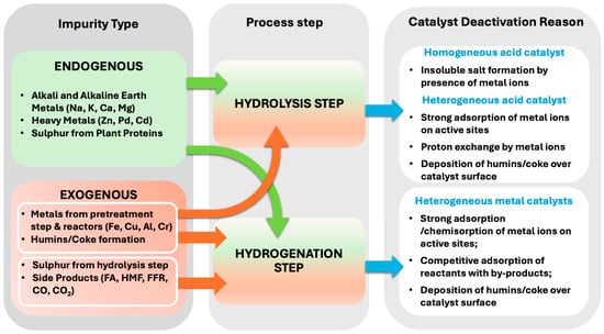 Impurities such as Pb, Cd, and Zn are also identified to influence the hydrolysis reaction. Their presence can result in catalyst deactivation as the protons of the solid acid catalysts can be replaced by these metal ions [62,63]. The summary of the effects of the impurities during the hydrolysis step is shown in Figure 6.