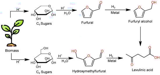 One of the most promising intermediates (platform molecules) that can be processed from the cellulose fraction, and in particular from the dehydration of C-6 carbohydrates, is levulinic acid (LA), used as a building block for the synthesis of many high added value chemicals [8]. The chemical processing of lignocellulosic biomass requires the implementation of a series of non-catalytic and catalytic processes to produce high added value compounds, and in particular the valuable LA platform molecule, that can be further converted into a wide span of valuable chemicals. Among them, γ-valerolactone (GVL) gained significant attention because of its versatile applications; for instance, it can be used as a solvent or precursor in chemical synthesis, or as biofuel or biofuel additive due to its low volatility, minimum toxicity, and good stability [9,10,11].