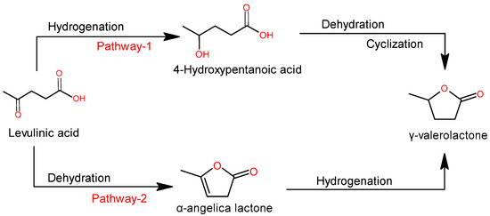 Further, the catalytic (upgrade) conversion of LA into GVL is reported to occur via two pathways, namely via 4-hydroxypentanoic acid (HPA) or α-angelica lactone (AL) intermediates (Scheme 2). The HPA reactional pathway initiates first with the hydrogenation of the carbonyl group of the LA to form the HPA intermediate which is further dehydrated with both esterification and ring closure to obtain GVL. By contrast, the alternative pathway takes place first with the dehydration of LA with ring closure to form the LA intermediate, which subsequently undergoes C=C bond hydrogenation to obtain GVL [32]. The HPA pathway occurs in mild conditions and is therefore proven to be thermodynamically preferred [33]. Furthermore, in the context of liquid-phase hydrogenation using metal-supported catalysts, it is reported that the reaction of LA progresses through HPA as an intermediate [33,34]. On the other hand, when hydrogenation takes place in the vapor phase, it results in the formation of α-angelica lactone [35,36].