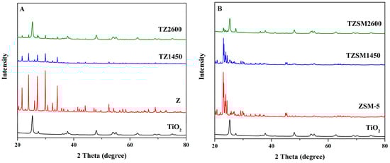 The phase composition of the composites prepared was firstly investigated by XRD analysis, and the results are shown in Figure 1. Distinct diffraction peaks related to the zeolite (Z or ZSM-5) were observed for all composites, regardless of the intensity or the weight fraction of zeolite. The characteristic peaks at 23.0° and 23.8° in TZSM1450 and TZSM2600 represent major ZSM-5 peaks [34,35]. The characteristic peaks of TiO2 anatase (JCPDS No. 00-021-12-72) at 2θ = 25.3°, 37.8°, 48.0°, 53.9°, 55.1°, 75.2° could be observed in all of the prepared composites, which were ascribed to the (101), (004), (200), (105), (211), and (215) planes, respectively. The intensity of the (101) TiO2 anatase peak was more intense for TZ2600 and TZSM2600 composites as a result of the weight fraction of TiO2 dispersed on the surface of the zeolite. In general, the XRD patterns of TZ2600 and TZSM2600 were almost the same as of pure TiO2. On the other hand, the peaks corresponding to the zeolite (Z or ZSM-5) were weak, which could be ascribed to the low content of zeolite in the composites and to the fact that the zeolite surface was assembled by TiO2 nanoparticles, resulting in a decline of zeolite peaks. Similarly, in the pattern of the TZSM1450 composite, the characteristic peaks of TiO2 were weaker as the content of TiO2 was lower.