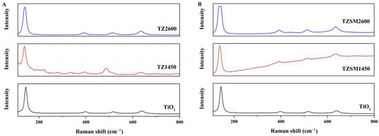 Figure 2. Raman spectra of (A) TZ and (B) TZSM composites. Different colors were used to distinct pure TiO2 from synthesized composites (spectra of composites calcined at 450 °C-red, composites calcined at 600 °C-blue).