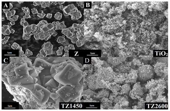 Figure 3. SEM images of (A) Z, (B) TiO2, (C) TZ1450 and (D) TZ2600.