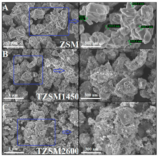 Figure 4. SEM images of (A) ZSM-5, (B) TZSM1450, and (C) TZSM2600 at 1 µm and 300 nm (partially enlarged view).