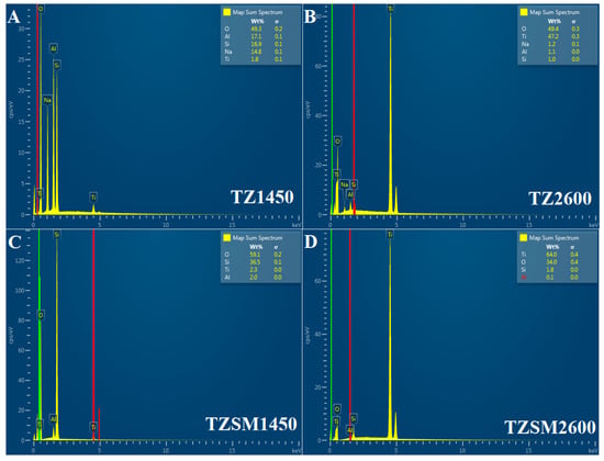 The presence of TiO2 on the surface of zeolite was confirmed by the EDS technique in all of the prepared composites (Figure 5). The Ti content was higher in TZ2600 and TZSM2600, which was in accordance with the applied amount of TiO2. In addition, the Si/Al ratio was calculated for all composites. It can be observed that the Si/Al ratios for TZ1450, TZ2600, TZSM1450, and TZSM2600 composites were about 0.99, 0.91, 18.25, and 18.00, respectively. It has been previously reported that the Si/Al ratio could affect photocatalytic activity. In particular, the increase in the Si/Al ratio could result in an improved photocatalytic activity of the material [38].