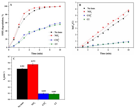 However, 56% and 60% SMX was still degraded within 10 min in the presence of Cl and CO 3 2 ions in the solution. The corresponding kd values in the presence of Cl and CO 3 2 ions were 0.089 min−1 and 0.095 min−1, respectively (Figure 9C).