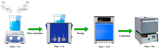 Zeolite is a material with distinctive properties including peculiar ion exchange [25,26], surface acidity, and inexpensive and environmentally benign nature [27,28]. Modifying TiO2 with zeolites may provide more active surfaces and prevent clotting, significantly improving the photodegradation performance of the catalyst. There are various studies on the application of TiO2/zeolite composites as a catalyst in photocatalytic reactions in the literature [29,30]. For example, An et al. [31] synthesized carbon doped-TiO2 coated on zeolites by solid-state dispersion and used it toward the degradation of eighteen pharmaceuticals and pesticides, including SMX. The results showed that the higher adsorption capacity of the zeolite improved the degradation efficiency of the photocatalyst. The study performed by An et al. [31] represents only the degradation of eighteen pharmaceuticals and pesticides, including SMX. Liu et al. [32] reported the successful photocatalytic degradation of sulfadiazine using natural zeolite coated with TiO2 under UV light irradiation. Zhang et al. [33] prepared a TiO2/zeolite composite using the hydrolysis deposition technique. The adsorption and catalytic properties of the prepared composites were evaluated in the elimination of gaseous and aqueous organic contaminants. The results revealed that the TiO2/acid leaching zeolite exhibited higher photodegradation activities than the bare TiO2 for formaldehyde, phenol, and rhodamine B.
