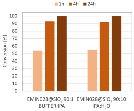 As can be observed from the graph, no significant difference in the conversion rate of 1c to 2c was observed. In addition, the enantiomeric excess of the product was higher than 99% for the (S)-enantiomer of 2c. Therefore, it was demonstrated that the catalytic performance of EMIN028@SiO2 was retained without depending on aqueous buffer conditions, which are generally preferred for enzymatic reactions.