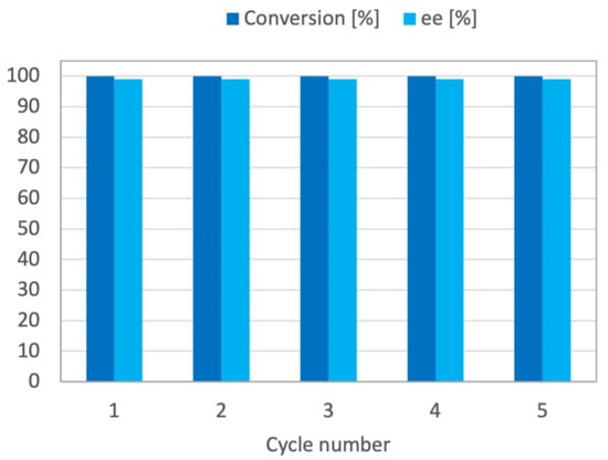 Conversion and ee data were determined as already described for batch tests. When complete conversion was reached and no substrate was detected, the column was washed with the reaction solvent mixture until no product was detected via HPLC. The column was then reused for five consecutive reaction cycles. The results are shown Figure 2.