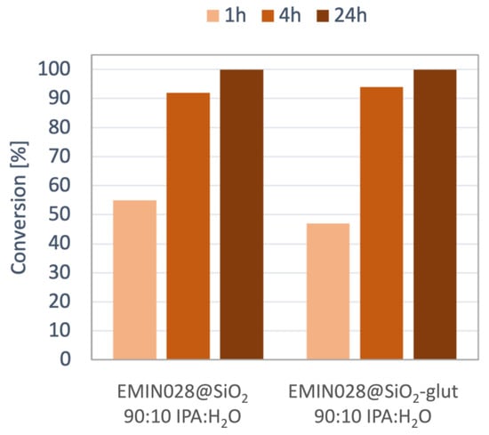 The efficiency of the cross-linking process was evaluated through the comparison of the results obtained in the reduction of 1c catalyzed by EMIN028@SiO2 and the immobilized sample after cross-linking the named EMIN028@SiO2-glut (Figure 3).