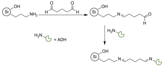 Immobilization through covalent bonds was performed by using 3-aminopropyl-functionalized silica gel. To provide a suitable linker, the support needs to be activated with glutaraldehyde. The aldehyde groups subsequently react with the amino groups of the enzyme, resulting in the formation of Schiff bases (Scheme 2) [,].