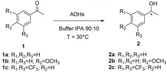Enantioselective reduction of prochiral ketones 1a–c catalyzed by ADHs.
