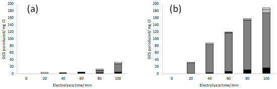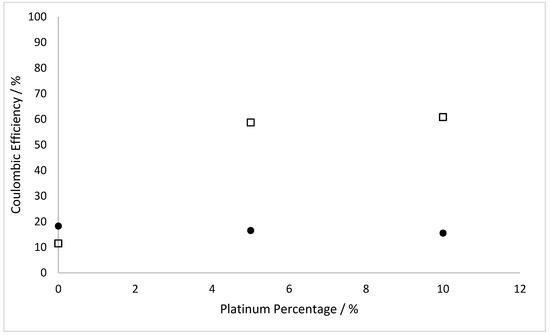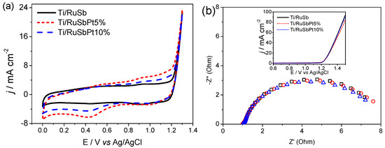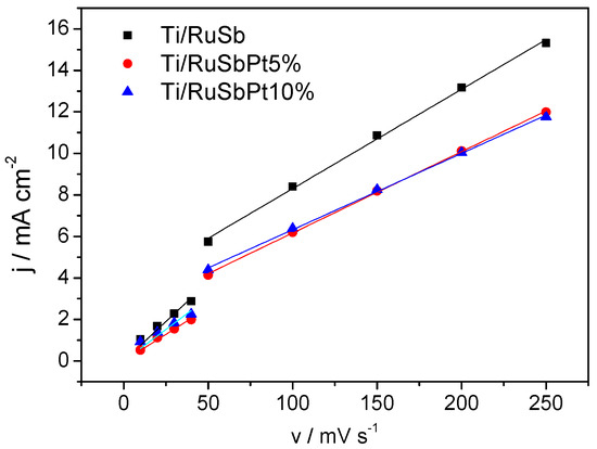 - The application of the developed anodes in electrolyzers for chlorine production revealed intriguing insights. At lower current densities (50 mA cm−2), current efficiency values remain low (~20%) and are almost independent of the composition of the electrode. In contrast, at higher current densities (150 mA cm−2), the influence of platinum in chlorine electrochemistry can be significantly observed. The inclusion of platinum has notably elevated the efficiencies towards chlorine formation, achieving an impressive increase of up to 60.5%.