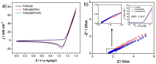 - Santos, M.O.; de OS Santos, G.; Mattedi, S.; Griza, S.; Eguiluz, K.I.; Salazar-Banda, G.R. Influence of the calcination temperature and ionic liquid used during synthesis procedure on the physical and electrochemical properties of Ti/(RuO2)0.8–(Sb2O4)0.2 anodes. J. Electroanal. Chem. 2018, 829, 116–128. [Google Scholar] [CrossRef]