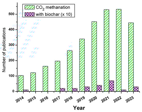 Thus, among the CO2 applications, the methanation reaction is simple to conduct under mild temperature conditions (in the 200–500 °C range); more importantly, such a reaction can be accomplished at ambient pressure []. These salient features of CO2 methanation make it highly popular; Figure 1 shows the remarkable increase in publications on CO2 methanation in the last ten years. Yet, CO2 methanation requires efficient catalysts, and in this regard, mono, bimetallic nanocatalysts and other metal/metal oxide combined catalysts have been employed in the pure form or in the dispersed state. In the latter case, high-surface-area catalyst supports are required, and numerous have been employed, namely silica, zeolite, clay, MOF, and carbon allotropes. However, the emerging high-performance material coined as “biochar” has just started to be investigated as a nanocatalyst support for CO2 methanation.