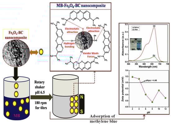 Iron oxygen nanoparticles modified with biochar materials for methylene blue (MB) adsorption. Adapted from [] with permission of Elsevier.
