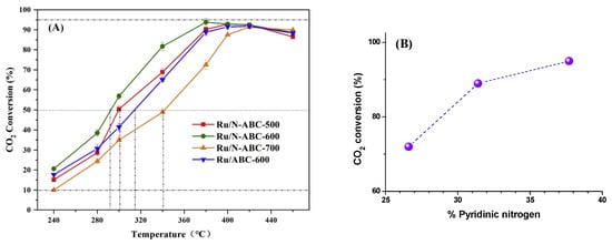 CO2 conversion of ruthenium-loaded nitrogen-doped biochar prepared at 500–700 °C (A), and plot of CO2 conversion (in%) to the percentage of biochar pyridinic nitrogen (B). Figure 5A is reproduced from ref. [] with permission of Elsevier.