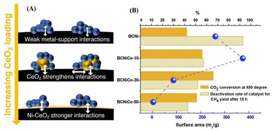 Model diagram of CeO2 doping amount on Ni-biochar (A); CO2 conversion, deactivation rate, and surface area of catalyst (B). (A) is reproduced from [] with permission of Elsevier.