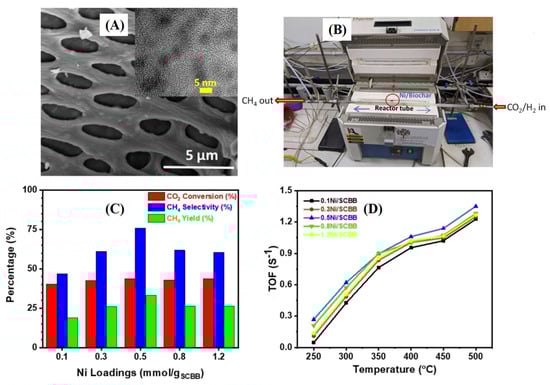 Properties and performance of Ni/SCBB composite catalysts: (A) SEM picture of 0.5Ni/SCBB; TEM is shown in inset; (B) CO2 methanation experimental setup; (C) CO2 conversion; CH4 selectivity and yield; (D) TOF for Ni/SCBB composites. Reproduced from ref. [] with permission of Elsevier.