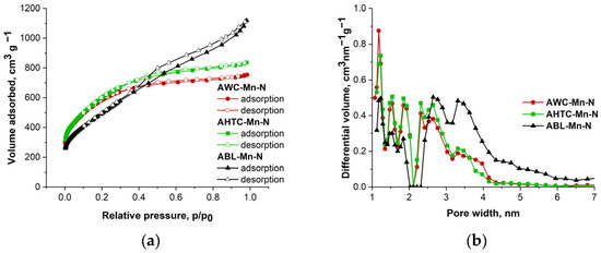 To characterize the porous structure of the obtained doped carbon materials, the surface area and pore size distribution of materials under study were determined from nitrogen adsorption–desorption isotherms at 77 K (Figure 1a). All obtained manganese and nitrogen co-doped carbon materials had a micro-mesoporous structure with high specific surface areas (SSAs). For activated wood char (AWC-Mn-N), hydrothermally carbonized wood (AHTC-Mn-N) and activated black liquor (ABL-MN-N), with Brunauer–Emmet–Teller (BET) 2127, 2195, and 1808 m2 g−1 SSA values were observed, respectively (Table 1). Pore sizes ranged from 1 to 4 nm when wood char and birch wood were used as precursors (Figure 1b), while slightly wider pores were formed when using black liquor as a precursor (ABL-Mn-N).