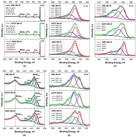 XPS (a) survey, (b) C 1s, (c) N 1s spectra, (d) Mn 2p, and (e) O 1s spectra of manganese- and nitrogen-doped activated carbon based on wood char (AWC-Mn-N), manganese- and nitrogen-doped activated carbon based on HTC wood (AHTC-Mn-N), and manganese- and nitrogen-doped activated carbon based on black liquor (ABL-Mn-N).
