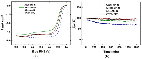 In the fuel cell working conditions, the stability of the catalyst materials is also one of the key factors. The chronoamperometry results can be seen in Figure 7b. The chronoamperometric testing at 0.6 V vs. RHE was carried out for 20 h. The results are in good accordance and are quite similar for all of the samples under study: for AWC-Mn-N the stability after 20 h remains around 95%, for ABL-Mn-N and AHTC-Mn-N the values are 92% and 87%, respectively. However, for the commercial Pt/C, the stability drops to about 70% after 20 h.