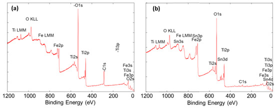 From a physicochemical point of view, X-ray diffraction (XRD), scanning electron microscopy (SEM), and transmission electron microscopy (TEM) analyses were carried out on the Ti-doped hematite photoanode as was previously reported by our group [35], confirming that the structure of hematite is characterized by nanocolumns of about 90 nm diameter length. Herein, the X-ray photoelectron spectroscopy (XPS) survey spectra of the Ti-doped hematite photoanode deposited over an FTO transparent glass are shown in Figure 2, before (Figure 2a) and after Ar sputtering for 40 min (Figure 2b). Thus, Figure 2a gives information on the surface of a Ti-doped Fe2O3 semiconductor characterized by an atomic percentage of 10.3%, 10. 7%, 50.4%, and 28.6% for Fe 2p3, Ti 2p, O1s, and C1s (sample holder), respectively. After sputtering, the analysis reported in Figure 2b involves the layers below the outermost ones (about 20–30 nm lower). In this case, the atomic percentage of Fe 2p3, Ti 2p, O1s, Sn 3d5, and C1s are 29.5%, 13.0%, 51.0%, 1.1%, and 5.4%. The ratio between Fe and Ti increases after sputtering due to the procedure of synthesis reported in our previous papers [35], where Ti doping is carried out after a chemical bath deposition of FeOOH/FTO. Furthermore, the FTO conductive layer (SnOx) began to appear at low atomic percentages.