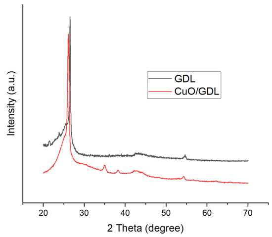 Figure 3. XRD of the CuO/GDL (red line) photocathode and GDL (black line) substrate.