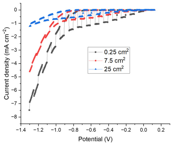 Figure 4 shows the results of the on-off experiments (5 s under illumination and 5 s in the dark) in which the photocurrent densities (Jlight − Jdark) of the three PECs are directly correlated to the water-splitting reactions. A negative effect of the photocurrent is evident within the scalability; at −0.6 V, i.e., at low bias potential values, the photocurrent decreases from 1.1 mA/cm2 with the 0.25 cm2 PEC to 0.42 mA/cm2 with the 25 cm2 PEC. These drawbacks, related to the scale-up process, could be explained in terms of optimal clamping between the membrane and photoelectrodes in the 0.25 cm2 lab cell, resulting in a better and simplified mass transfer of reagents and products and, consequently, in an improved photocurrent density. Furthermore, the electron–hole recombination of the semiconductors increases as a function of larger active areas and distance between the electrons and the FTO conductive layer.