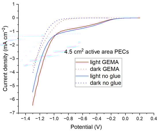 The first attempts to achieve a GEMA were carried out by hot pressing at 60 °C and 20 Kgf cm−2. However, this technique led to facile FTO glass breakage and it was necessary to develop an alternative methodology, which consisted of using an ionomer “glue” (see Section 3.2) to fix the layers together, obtaining a GEMA without glass-breaking issues. The GEMA was tested in the small area test cell, with electrochemical results comparable to those in the conventional configuration. For instance, the polarization curves shown in Figure 5 compare the 4.5 cm2 conventional clamped PEC (without glue) and 4.5 cm2 PEC based on the definitive GEMA concept (with glue). The photocurrents in the two PECs were comparable, mainly in our region of interest (below −0.8 V), i.e., at a low bias-assisted region. At −0.6 V bias-assisted potential, the dark current is zero, and there is only a slight difference between the two cells; under illumination, current densities of 0.67 mA cm−2 and 0.76 mA cm−2 were achieved for the PEC based on the GEMA concept and that assembled without glue, respectively. The current density values at −1.3 V are between 0.25 cm2 and 7.5 cm2, as depicted in Figure 4.
