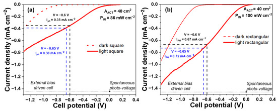 After optimization, square and rectangular PECs with a 40 cm2 active area were obtained with a procedure detailed in Figure S8. In a 40 cm2 square clamped PEC, the photocurrent is 0.35 mA cm−2 at −0.6 V (Figure 7a). In contrast, the results of rectangular clamped PEC with the same geometric area correspond to a photocurrent of 0.67 mA cm−2 at −0.6 V (Figure 7b).