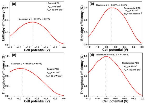 These results are reflected also in the efficiency values calculated by Equations (1) and (2) in Section 3.6 and displayed in Figure 8. The increase in function of a larger photocurrent (Iph) and a lower bias potential (Ebias) normalizes the power irradiation (Pin). At a fixed value of Ebias, greater photocurrents of the PEC, i.e., the difference between current density under illumination and in the dark, results in higher increases in the efficiency values. Maximum enthalpy efficiencies are 0.37% (Figure 8a) and 0.6% (Figure 8b) at −0.69 V, for the square and rectangular clamped PECs, respectively.