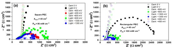 Figure 9 compares the EIS spectra of the 40 cm2 clamped PECs; Rs and Rp achieve a significant shift toward lower values. The Rs is 200 Ωcm2 in both PECs, whereas the main issues are related, as usual, to the Rp, which is 1.2 kΩcm2 in the square cell and less than 800 Ωcm2 in the rectangular cell at −0.4 V. This value is lower in comparison with the other cell, probably due to a more homogeneous pressure, resulting in improved photo-electrodes-membrane interfaces.