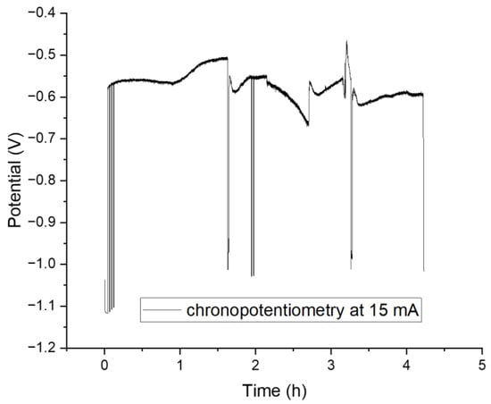 Chronopotentiometry was carried out at 15 mA to investigate the potential over time for 5 h.