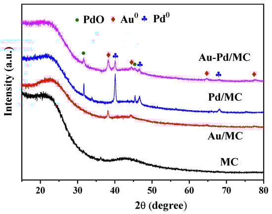 Figure 1 shows the XRD patterns of the Au-Pd/MC sample with Au/MC, Pd/MC, and MC as a comparison. All the samples had two broad peaks at 21.4 and 42.8°, which belonged to amorphous carbon [35,36]. The intensity of carbon peaks reduced after metal loading, which was caused by the partial coverage of the carbon surface by metal nanoparticles. Apart from the carbon peaks, the diffraction peaks at 38.2, 44.4, 64.6, and 77.6° in Au/MC can be indexed as (111), (200), (220), and (311) planes of metallic Au0 [37]. For the Pd/MC sample, the diffraction peaks at 40.1, 46.7, and 68.2° could be attributed to (111), (200), and (220) planes of Pd0, while the diffraction peaks at 27.3 and 31.7° could be assigned to (200) and (220) planes of PdO particles, respectively [38,39]. In contrast with monometallic Au/MC and Pd/MC catalysts, these peaks of metallic Au, metallic Pd, and PdO were all observed in bimetallic Au-Pd/MC. Upon careful observation, the intensity of Pd and PdO peaks in Au-Pd/MC were weaker and broader than those of the monometallic Pd/MC catalyst, revealing the smaller sizes of metal and metal oxide particles in the bimetallic catalyst [40]. These results implied the formation of Au-Pd nanocomposites.