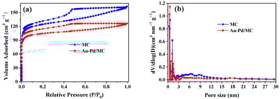 Nitrogen sorption isotherms were conducted to analyze the porous structure of Au-Pd/MC and MC, and the results are shown in Figure 2. Typical type-IV isotherms were observed in both MC and Au-Pd/MC [41]. The presence of hysteresis loops at a relative pressure of 0.2–0.8 implied a mesoporous character in both samples [34]. Both Au-Pd/MC and MC displayed considerable N2 adsorption at a low pressure lower than 0.1, indicating rich microporosity. The N2 adsorption amount at both low pressure and medium pressure slightly decreased after metal loading, indicating the smaller surface area and porosity of Au-Pd/MC. This was possibly caused by the blockage of pores by the metal nanoparticles. The pore size distributions (Figure 2b), determined by the density functional theory (DFT) model, supported the well-defined micro-mesopore size distribution in both Au-Pd/MC and MC. Table 1 illustrates the calculated specific surface areas (SBET) and pore volumes. The SBET and total pore volume (Vtotal) of the MC sample were 485 m2 g−1 and 0.26 cm3 g−1, respectively. Wherein, the micropore volume (Vmicro) accounted for 64%. The high SBET and appropriate pore diameter of MC afforded promising support for catalysts. In contrast, SBET decreased slightly after loading metallic nanoparticles, and it remained at a considerable SBET value of >410 m2 g−1 and a high Vtotal of >0.18 cm3 g−1, suggesting that most of the pores were accessible. It was worth noting that the proportion of Vmicro increased to 78.9% in Au-Pd/MC, implying that Au-Pd nanoparticles preferred to anchor on the mesoporous surface of carbon material.