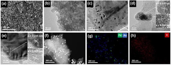 (a) SEM image of MC, TEM images (b) of MC and (c) Au-Pd(1:3)/MC, (d,e) HRTEM images of Au-Pd/MC, and (f–h) the corresponding mapping images of elemental Pd, Au and C.