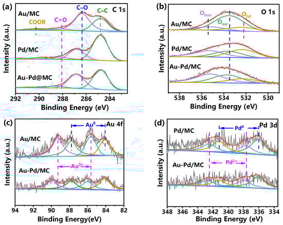 XPS spectra were also measured to investigate the surface chemical composition and chemical state of Au-Pd/MC, with a monometallic catalyst as a comparison. Au-Pd/MC mainly had four elements: C, O, Au, and Pd. As shown in Figure 4a, there were four types of carbon in carbon-supported samples, including the C–C group at 284.6 eV, the C–O group at 286.3 eV, the C=O group at 288.1 eV, and the COOR group at 289.7 eV [44,45]. Compared to Au/MC, the C–O and C=O peaks of Pd/MC and Au-Pd/MC shifted 0.3–0.5 V toward higher binding energy. Due to the difference in electronegativity between Au and Pd, the shift of C–O and C=O peaks might relate to the reduction in the electron density of adjacent C atoms by the formation of Au–O or Pd–O bonds [34]. As displayed in Figure 4b, the O 1s XPS spectra of Au/MC catalysts can be grouped into three peaks at 532.3, 533.5, and 535.3 eV, assignable to lattice oxygen species (Olat), surface adsorbed oxygen species (Osur), and surface hydroxyl species (OOH), respectively [46,47]. Similarly, three peaks were observed in Pd/MC and Au-Pd/MC, except that the Osur peak shifted 0.1–0.2 eV toward higher binding energy, supporting the formation of Au–O or Pd–O bonds. As shown in Table S1, the concentrations of surface oxygen in the Au/MC, Pd/MC, and Au-Pd/MC samples, calculated by XPS, were 13.3 at%, 12.3 at%, and 13.8 at%, respectively. The result confirmed the presence of abundant oxygen-containing functional groups on the carbon surface. The component proportion of Olat, Osur, and OOH in the Au-Pd/MC was 18.8%, 34.2%, and 47.0% in the total O atoms, respectively. Osur might serve as the primary anchoring site to bond Au-Pd nanocomposites.