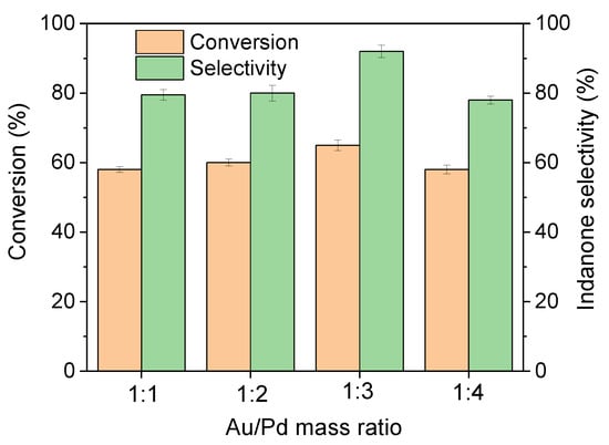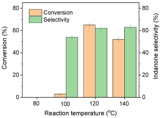 Under 120 °C and 1 bar of O2 for 8 h, the catalytic activity of Au-Pd/MC catalysts with different Au/Pd mass ratios (1:1, 1:2, 1:3, 1:4) was tested by the aerobic oxidation of indane. Figure 6 displayed that by elevating the Au/Pd mass ratio from 1:1 to 1:3, both the conversion and indanone selectivity gradually improved. The highest activity of Au-Pd/MC, with 71% conversion and 92% indanone selectivity, could be obtained when the Au/Pd mass ratio was 1:3. A negative effect on indanone yield appeared when the ratio was 1:4. It was concluded that the Au/Pd ratio had a great impact on the transformation of indane as well as indanone selectivity. These results supported the synergistic effect in the Au-Pd/MC catalyst. Hence, the Au/Pd mass ratio of Au-Pd/MC is decided as 1:3 in this work. The influence of reaction temperature on the catalytic activity was also studied using the optimized Au-Pd catalyst. As shown in Figure 7, when the reaction proceeded at 80 °C, indane was hard to convert. The indane conversion and indanone selectivity were remarkably enhanced by increasing the temperature up to 120 °C. Further, by increasing the reaction temperature to 140 °C, the indane conversion was slightly reduced. Therefore, the optimized reaction temperature for the catalytic oxidation system was 120 °C.