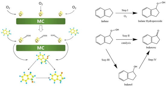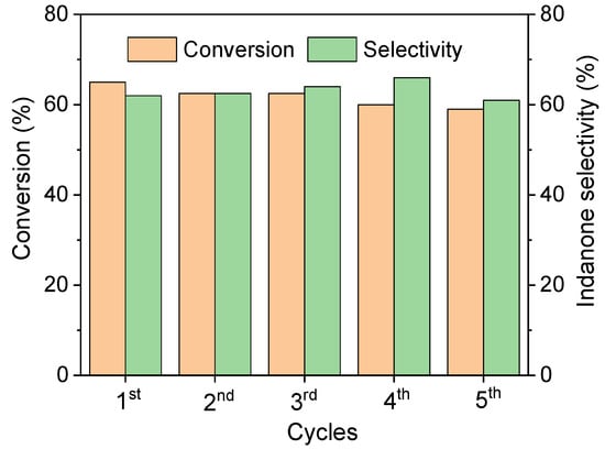 In a typical reaction, 4 mL of indane and 20 mg of catalyst were added into a 10 mL three-neck glass reactor, which was fitted with a magnetic stirrer and an O2 inlet tube. The reaction was carried out at a desired temperature with magnetic stirring. O2 was passed into the reaction mixture and controlled by a flow meter at a constant flow rate (5 mL min−1). After completion of the reaction, the liquid-phase solution of the reaction mixture was collected by filtration. Then, the reaction solution was diluted with acetone and measured by gas chromatography (GC, Shimadzu, Kyoto, Japan, 2010 plus). The oxidized product was confirmed by GC coupled with a mass spectrometer (GC–MS, Shimadzu, 2010 plus).