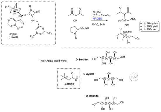 Examples of Michael reactions with the Rawal Organocatalyst conducted in betaine-derived NADESs [,].