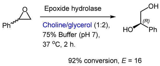 This pioneering work showed the far superior performance in the NADES chosen to conduct this ring-opening hydrolysis, with 92% conversion in comparison to <5% in a “standard” aqueous buffer. It seems that the (R)-enantiomer was the favored isomer, and the enantioselectivity of the kinetic resolution was moderate (E = 16).