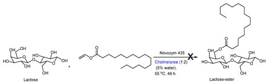 Failed transesterification of lactose with vinyl palmitate (acyl donor) by Ubialli and co-workers [].