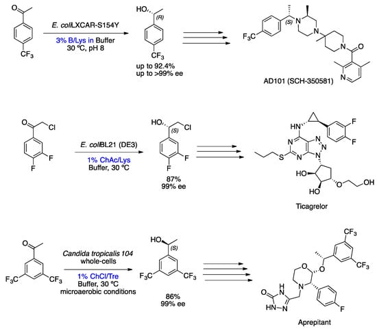 The preparation of chiral bioactive compounds, in many instances, requires enantiopure precursors, consequently implying that stereoselective reactions that can be catalyzed by biocatalysts in unconventional solvents, such as NADES solvents. As already mentioned, these solvents are very viscous and sometimes compromise the activity of the biocatalyst and, consequently, the productivity and enantioselectivity of the reaction. However, NADESs are increasingly being used in biocatalytic reactions, even though in smaller quantities than the buffer co-solvents. Further examples of the great potential of NADESs for biocatalysis are shown in Scheme 8. All of these examples are bioreductions of acetophenone derivatives, which have provided key enantiopure intermediates to important bioactive compounds, such as AD101 (SCH-350581) [,], Ticagrelor [] and Aprepitant [,]. Xia et al. reported the preparation of (R)-1-[4-(trifluoromethyl)phenyl]ethanol through the bioreduction of 4-(trifluoromethyl)acetophenone biocatalyzed by recombinant E. coli LXCAR-S154Y and Geotrichum ZJPH1810, using 3% NADES/DES as co-solvents in a buffer (Scheme 8). The Betaine (B)/Lysine (Lys) (NADES) was chosen from the four DESs and 13 NADESs examined in this reaction, providing the desired product in up to 92.4% yield and up to 99% ee (preparative scale) at a substrate concentration of 400 mM []. He et al. described a stereoselective bioreduction of 2-chloro-1-(3,4-difluorophenyl)ethanone to (S)-2-chloro-1-(3,4-difluorophenyl)ethanol catalyzed by recombinant Escherichia coli cells in reaction media containing 1% choline acetate (ChAc)/Lys with a buffer (Scheme 8). This ChAc/Lys mixture was selected from several NADESs due to enhanced coenzyme regeneration and improved cell membrane permeability during bioreduction, which explains the high conversion. The result was excellent, and the enzymatic reduction of the keto-molecule precursor made it possible to obtain the (S)-chlorohydrin with a yield of 87% and enantioselectivity of 99% ee with 1 M of substrate. Furthermore, the substrate loading in the established ChAc/Lys buffer mixture was increased 3.3-fold compared to the aqueous medium []. Another example reported by Zhu et al. was the enantioselective synthesis of (S)-1-[3,5-bis(trifluoromethyl)phenyl]ethanol in 86% yield and 99% ee through the bioreduction of the corresponding carbonyl group promoted by whole cells of Candida tropicalis 104 in 1% w/v NADES (mixture of ChCl/Trehalose (Tre) (1:1)) in a buffer (Scheme 8). The use of NADES as a reaction medium has been shown to be advantageous, increasing yield, cell viability, and cell membrane permeability to the substrate and, at the same time, protecting the cell [].