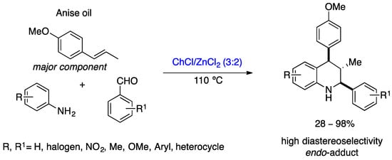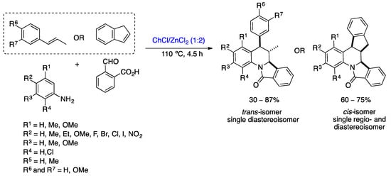 Recently, Sanabria-Sánchez et al. developed a multicomponent, diastereoselective, one-pot Povarov reaction in DESs for the preparation of a wide variety of dihydroisoindolo[2,1-a]quinolin-11-ones derivatives. Similar to the methodology described by Peñaranda-Gómez et al. [], the DESs act as both the solvent and catalyst. Various DESs consisting of Lewis or Brønsted acids were studied, such as ChCl/ZnCl2, Urea/ZnCl2, ChCl/MgCl2, ChCl/SnCl2, ChCl/APTS, ChCl/CF3SO3H, and ZnCl2/ethylene glycol and reaction conditions to choose the best system, ChCl/ZnCl2 (1:2) at 110 °C for 4.5 h (Scheme 10) []. Twenty dihydroisoindolo[2,1-a]quinoline-11-one derivatives were prepared with yields of up to 87% and high diastereoselectivities by reacting a wide variety of anilines, alkenes (trans-anethole, methyl eugenol, and indene), and 2-formylbenzoic acid in ChCl/ZnCl2 (1:2) at 110 °C for 4.5 h. 1H NMR analysis of the compounds confirmed the production of a single diastereoisomer, the 6,6a-trans isomer. In addition, the DES mixture could be reused for six cycles without loss of activity.