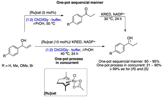 The first successful example of the integration of metal and biological catalysis in DESs/buffer mixtures was reported in 2018 []. This chemoenzymatic cascade consists of the ruthenium-catalyzed isomerization reaction of allylic alcohols to an α,β-saturated ketone, followed by enantioselective enzymatic reduction promoted by ketoreductases (KREDs), providing enantiopure alcohols (Scheme 12). This chemoenzymatic cascade was carried out using two different approaches, a sequential reaction (one-pot in two steps) and a simultaneous (concurrent) reaction (one-pot in one step). The choice of solvent mixture, based on DESs and buffers, was made carefully, making it possible for both reactions to take place without inhibiting the metal catalyst or the enzyme. The best mixture of DESs was ChCl/glycerol (1:2) or ChCl/sorbitol (1:1) for enantioselective bioreduction; however, for the chemoenzymatic reactions, the first mixture of DESs was chosen due to the high viscosity of the sorbitol-based DES, even at 40 °C. In the case of the sequential approach (one-pot in two stages), the first stage involves the Ru-catalyzed isomerization of racemic allylic alcohols in DESs buffer, i-PrOH at 50 °C, after consumption of the starting material; for the second stage, the temperature was reduced to 30 °C and KRED and its cofactor (NADP+), obtaining the desired chiral alcohols in good-to-excellent yields and high enantioselectivities. With regard to the second approach, the simultaneous reaction (one pot in one step), both catalysts were added at the start of the reaction; for this reason, the enzyme showed poor stability in the aqueous buffer, resulting in incomplete reactions, providing the desired product mixed with unreacted ketone, and in some cases, allyl alcohol was also obtained, indicating slow isomerization. However, five chiral saturated alcohols were prepared in low-to-excellent yields and with excellent enantioselectivities via the chemoenzymatic reaction of allylic alcohols catalyzed by KRED and Ru complex (10% mol) at 40 °C in ChCl/Gly (1:2)/buffer (4:1) (Scheme 12).