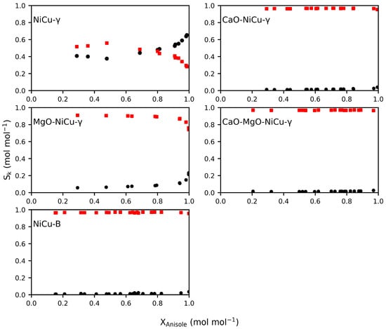 The selectivity of products (Sk): ■ = methoxycyclohexane and ● = cyclohexane, as function of conversion (XAnisole) for A = NiCu-γ, B = CaO-NiCu-γ, C = MgO-NiCu-γ, D = CaO-MgO-NiCu-γ, E = NiCu-B. The conditions used were a temperature of 200 °C, a pressure of 0.5 Mpa, and a H2/anisole () of 50. The space time was varied between 3–52 kg s . Measurements were consistently taken between 1 h and 2.5 h of Time On Stream.