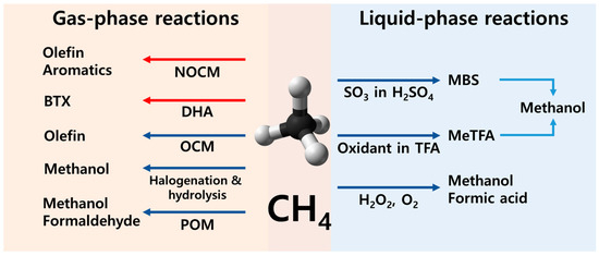 Direct conversion of methane to various chemicals. The red and blue arrows mean endothermic and exothermic reactions, respectively.