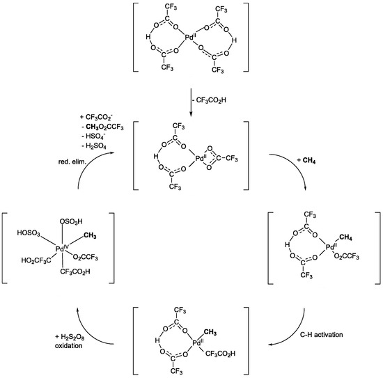 Over the last few decades, homogeneous organometallic catalysts have been investigated for the selective oxidation of methane in strong acids [4,10]. Because methane has a strong C-H bond, the choice of the central metal and ligand is important for the activation of methane. In addition, an appropriate choice of oxidizing agent is important to activate C-H bonds, oxidize low-valent central metals to high-valent ones, and avoid the overoxidation of methane oxygenates and ligand degradation. The use of strong acids (e.g., H2SO4 and HTFA) is beneficial for stabilizing the reaction intermediates (MBS and MeTFA) because these methanol precursors are more resistant to electrophilic attack than the methanol itself.
